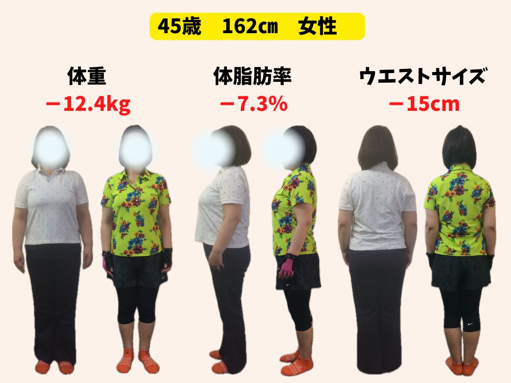 そのままトレーニングを継続してくださり、-10㎏以上の方も多数おられます!(写真をクリックするとお客様のお声が見られます)